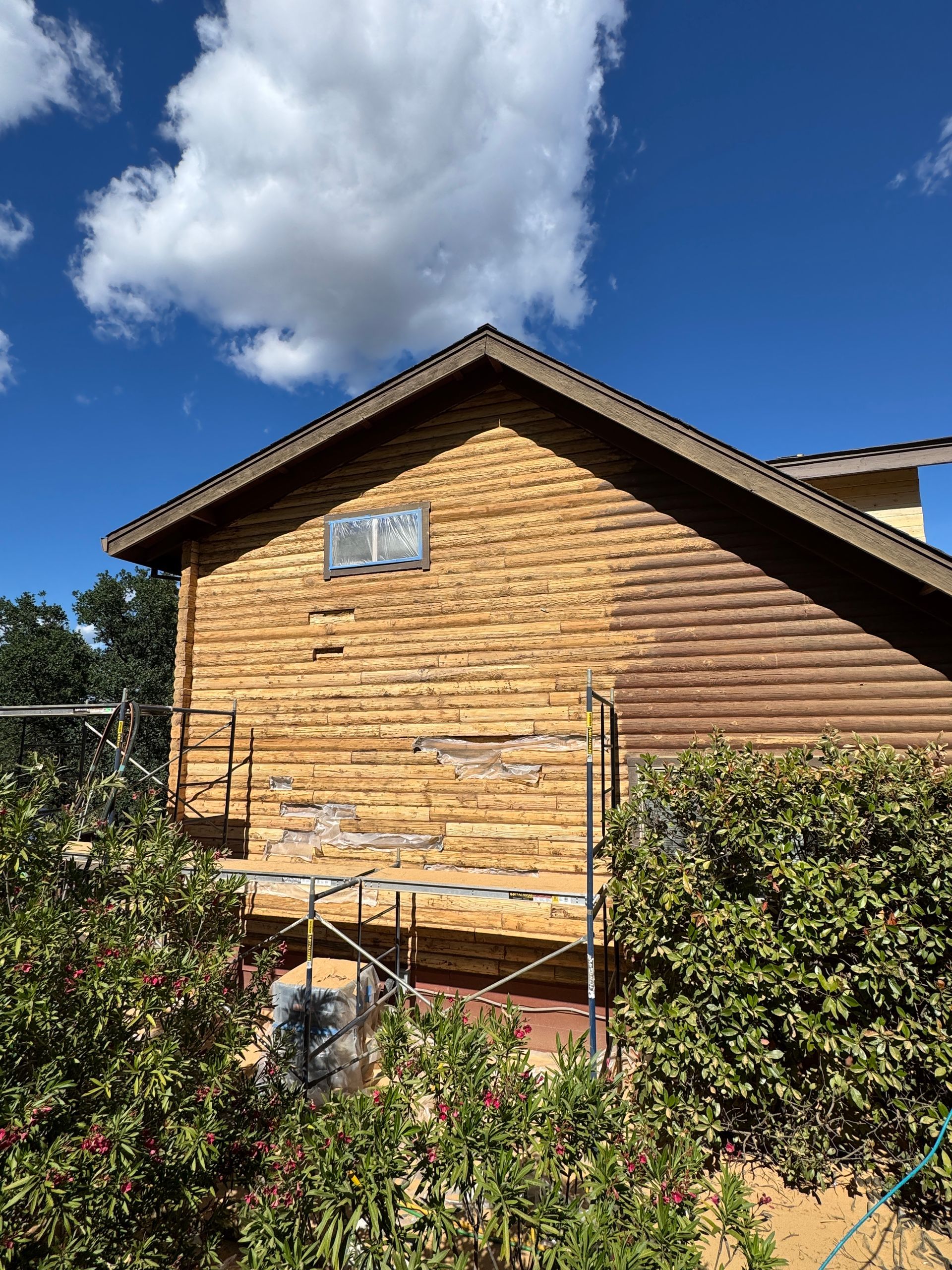 Exterior restoration is underway with a focus on masonry cleaning, chink removal, and precise surface preparation. From staining and trim detailing to media blasting and siding work, each step is carefully executed to deliver a refined and durable finish.