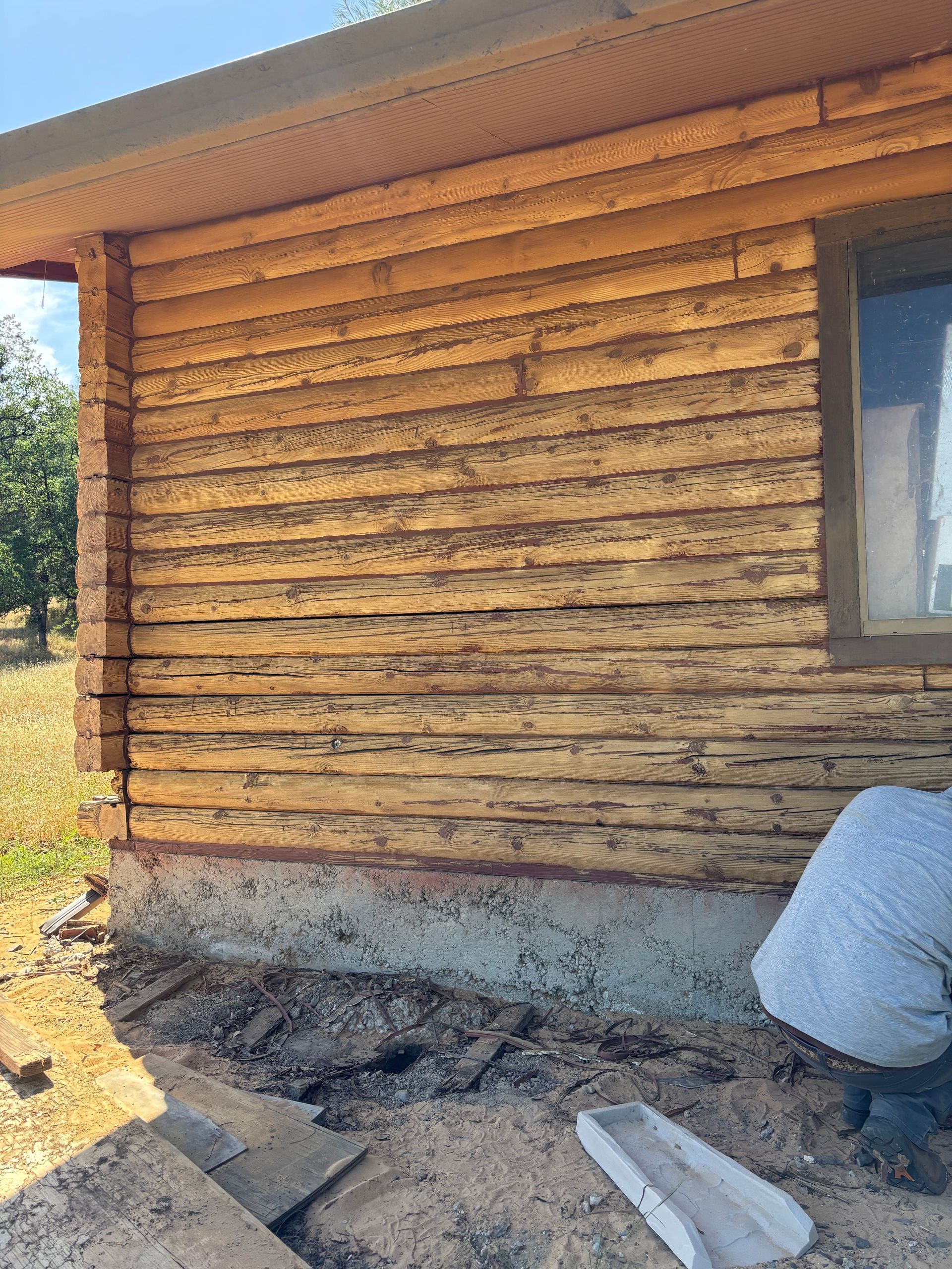Extensive cleaning and removal of deteriorated chinking have been completed to restore the integrity of exterior walls, creating a solid foundation for new finishes.