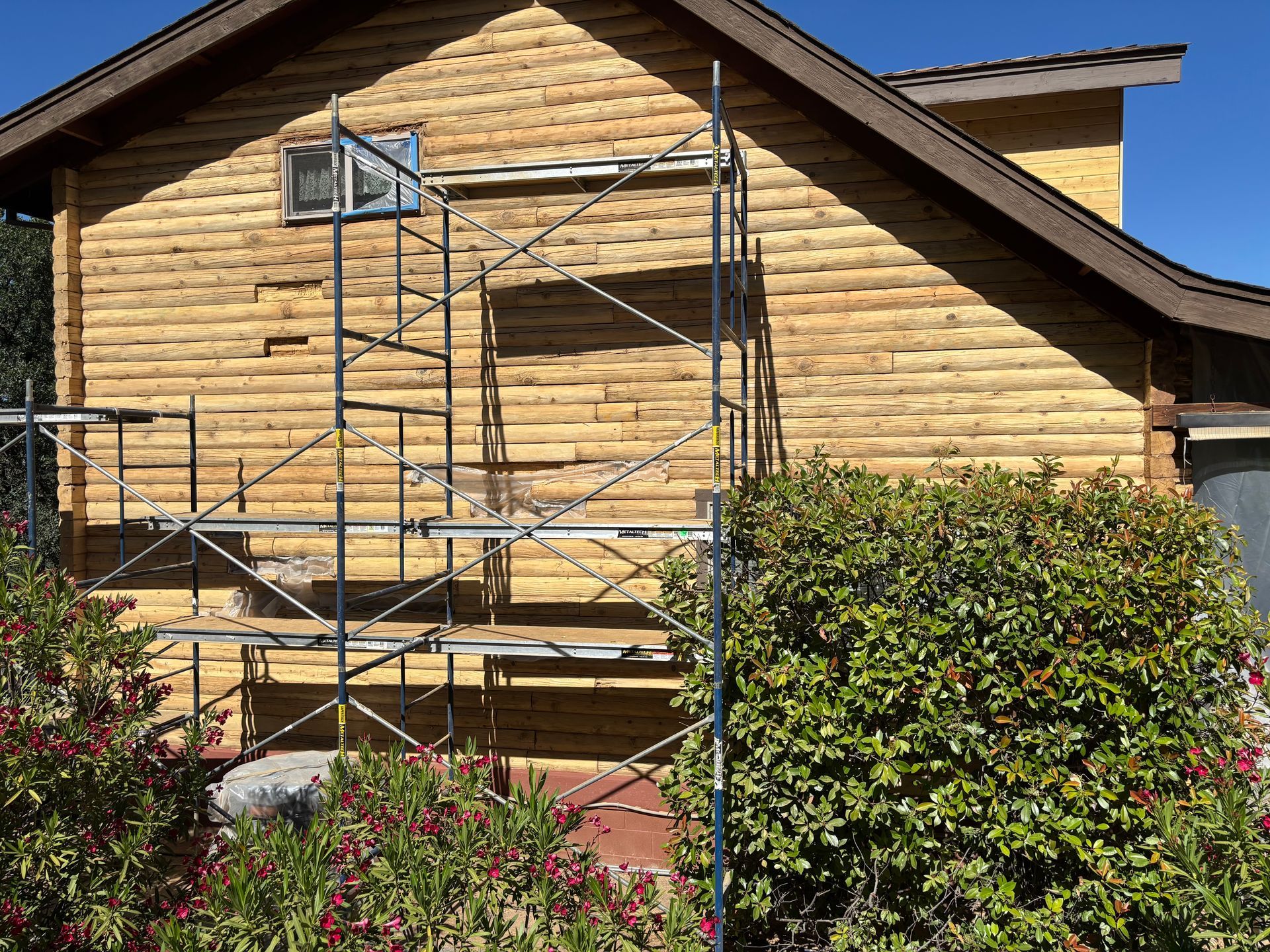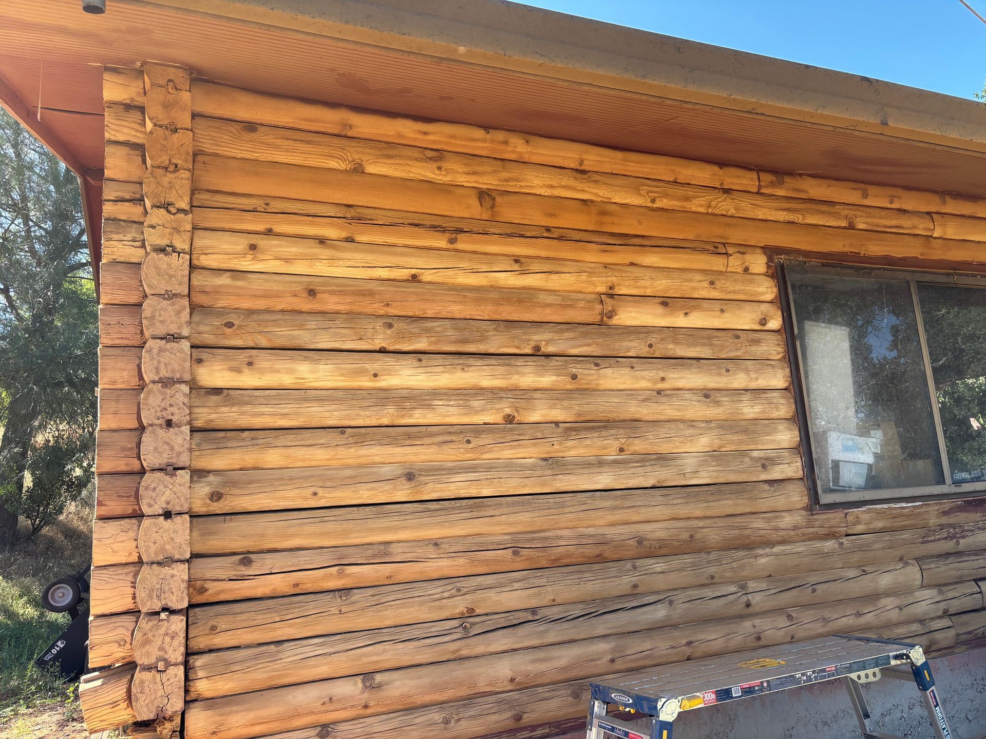 | Phases : | Preparation · Chink Removal · Sanding · Media Blasting · Staining · Trim Detailing |