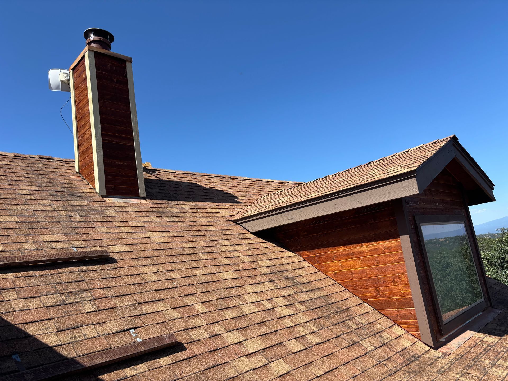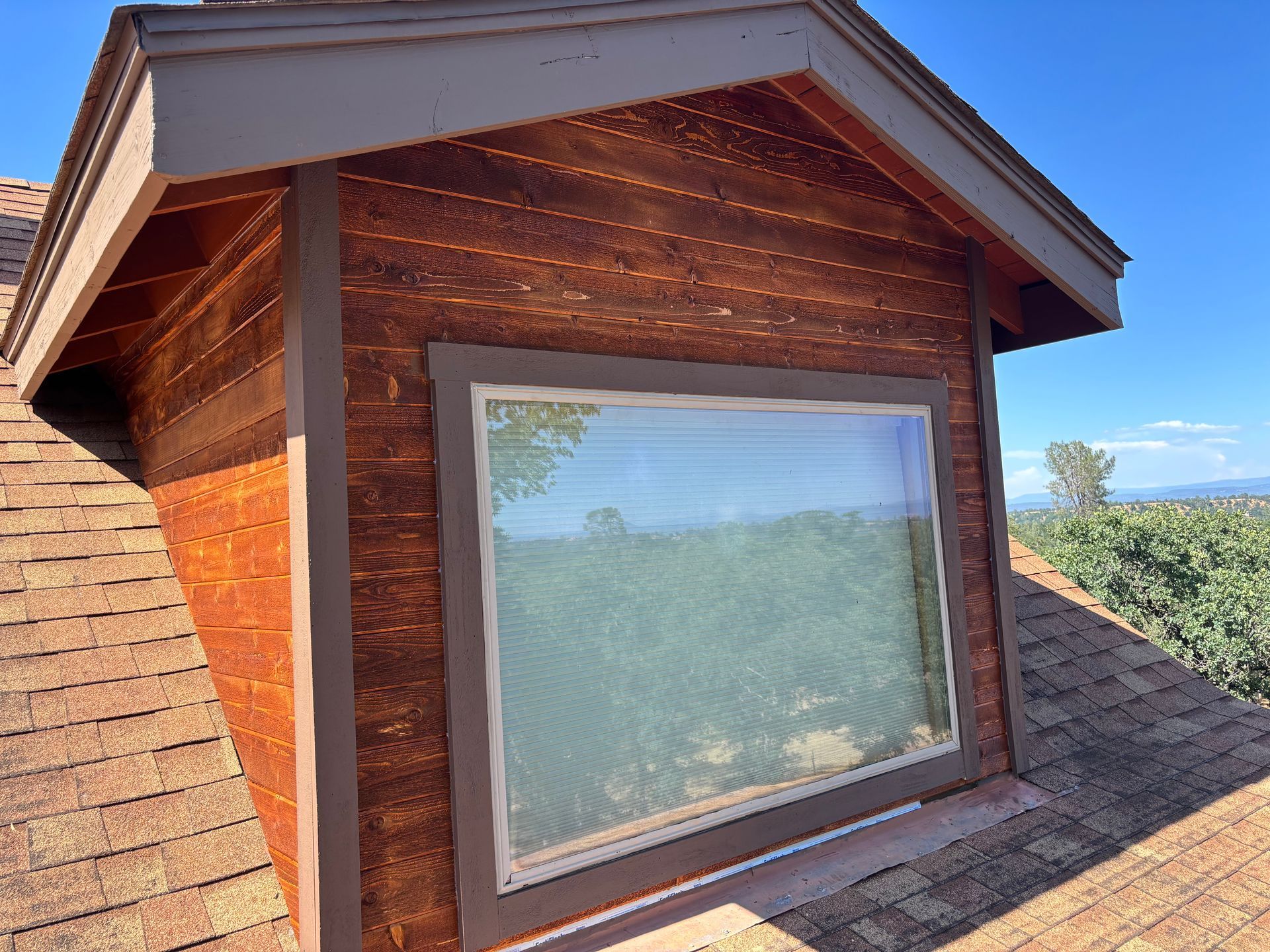 Staining of dormers and the chimney has been carefully completed, accompanied by trim painting and caulking. Each element has been refined to achieve a cohesive appearance and enhanced protection against the elements.