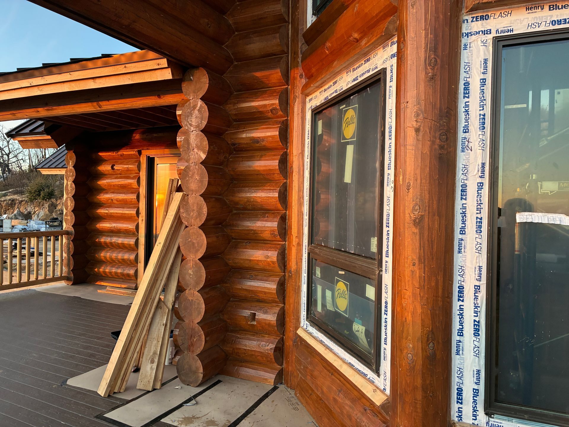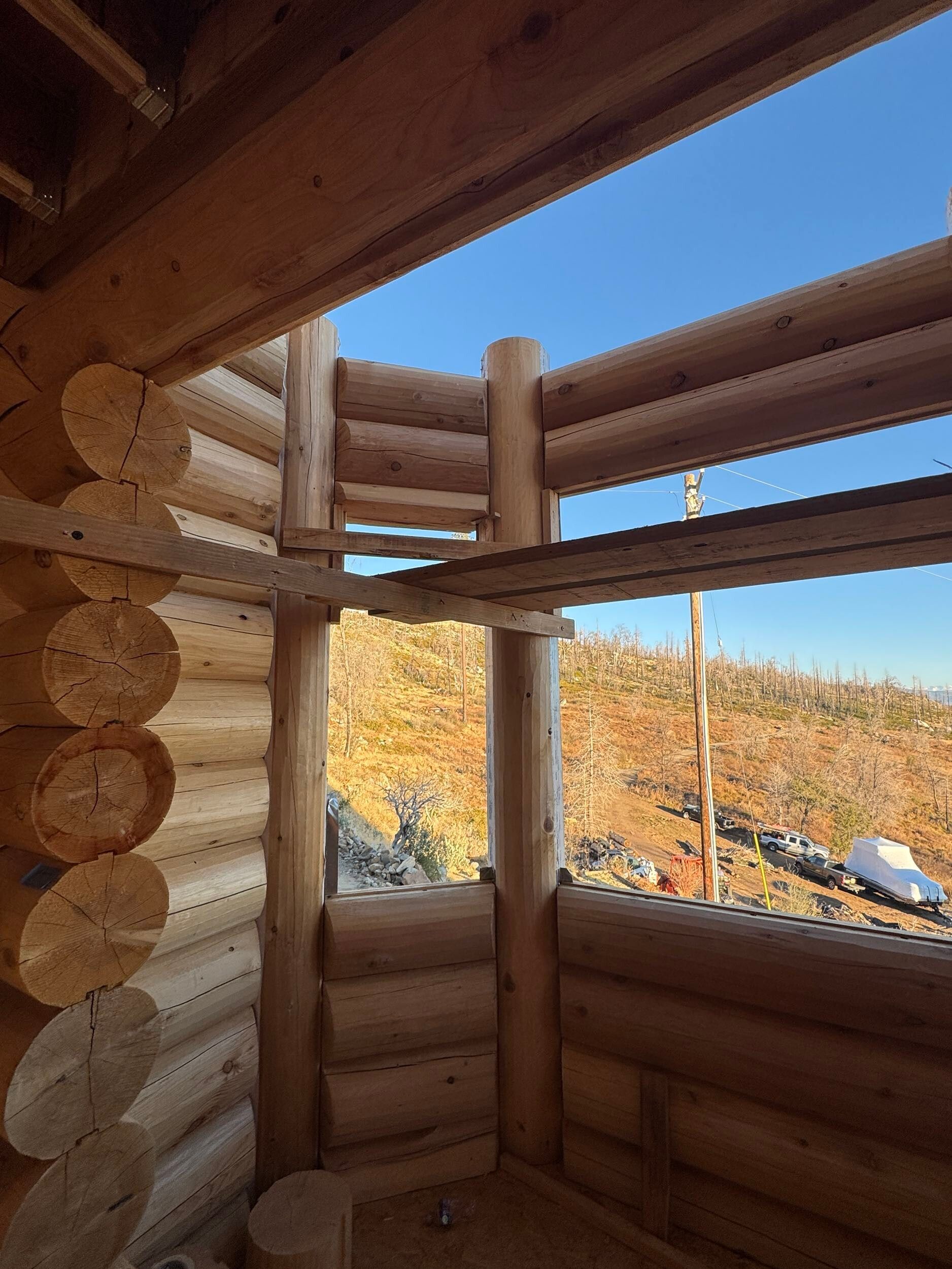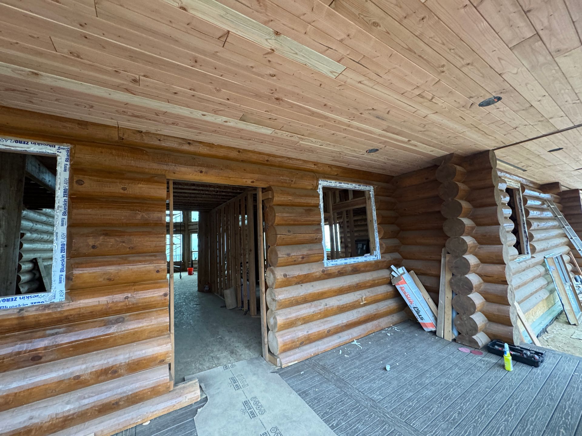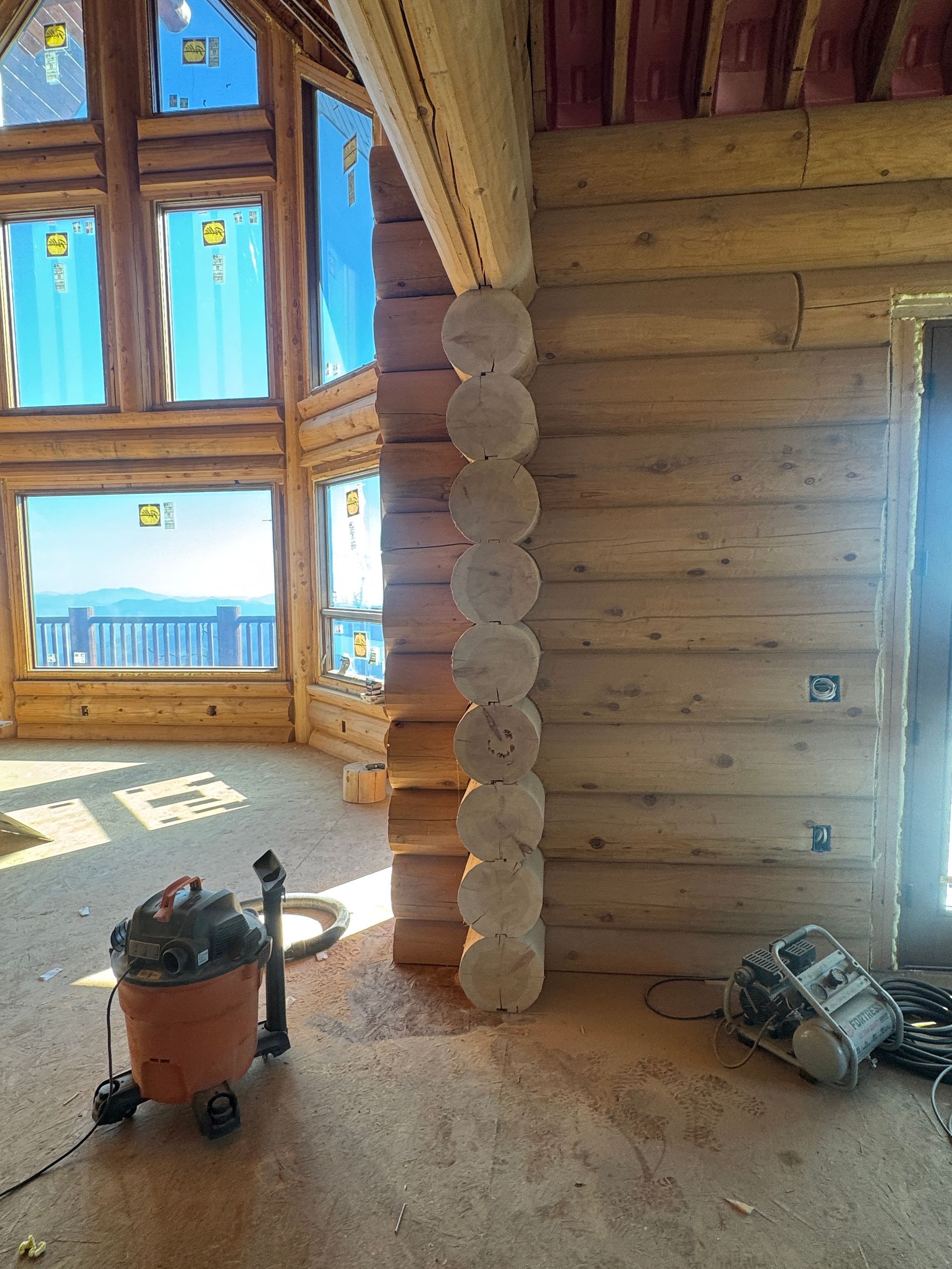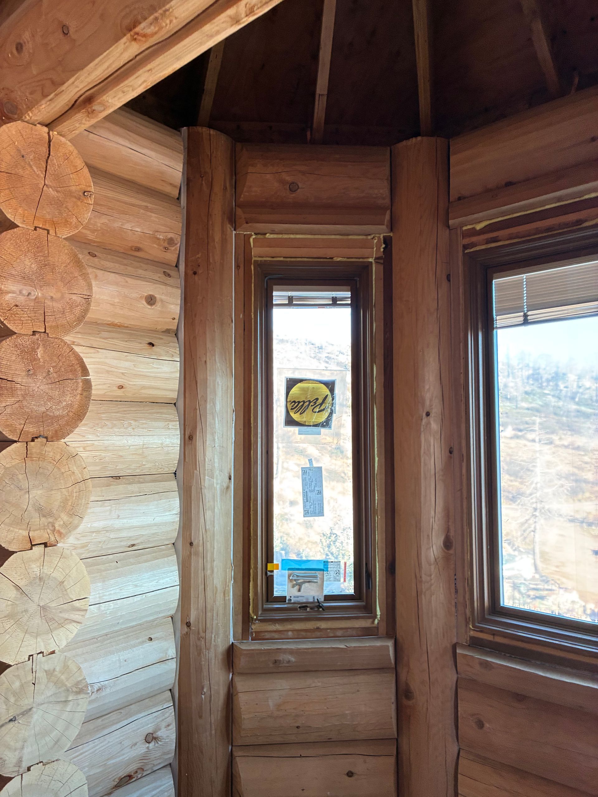 Interior chinking is completed around windows and doors, with ongoing work on exterior post detailing for consistency and protection.