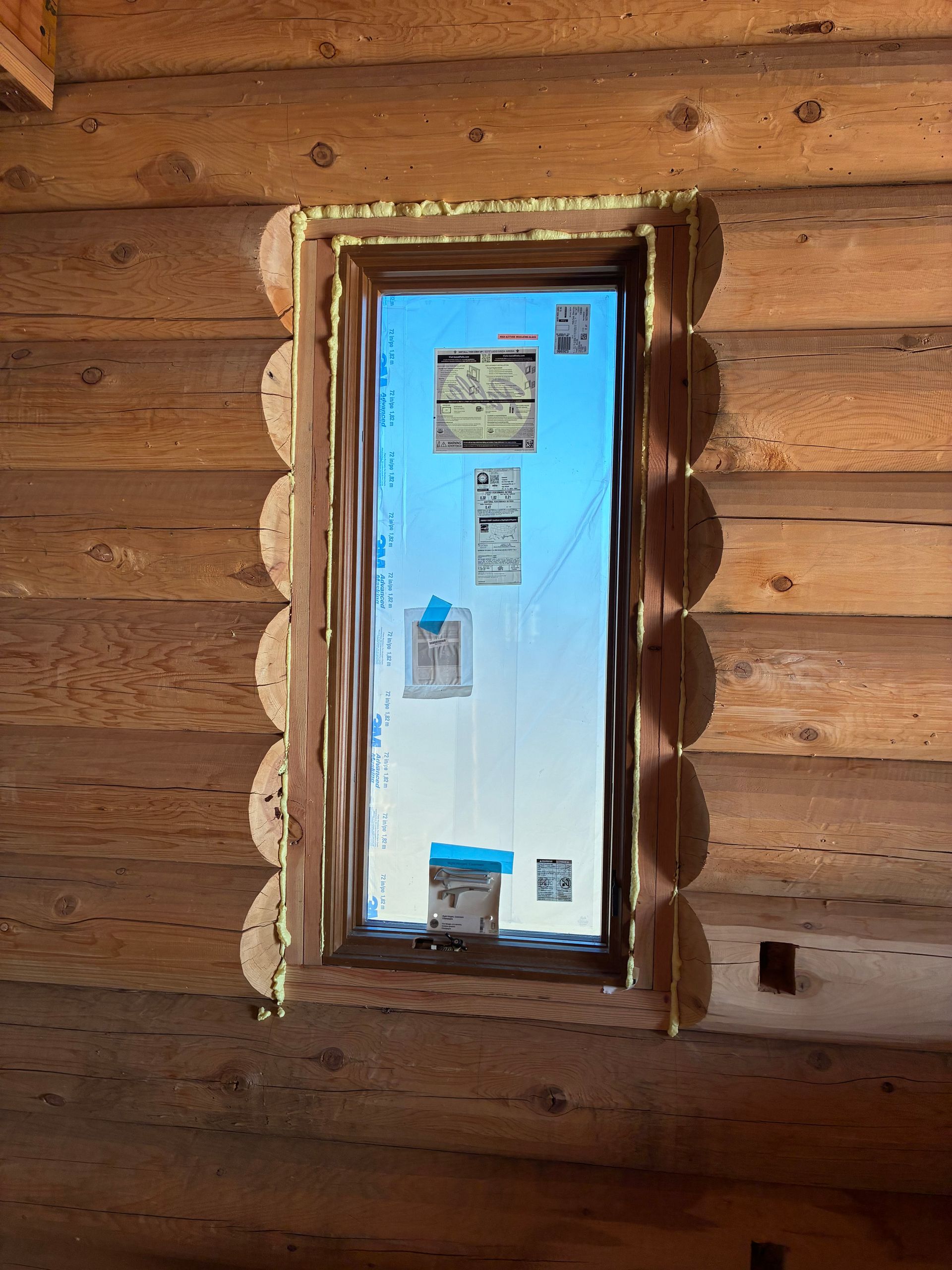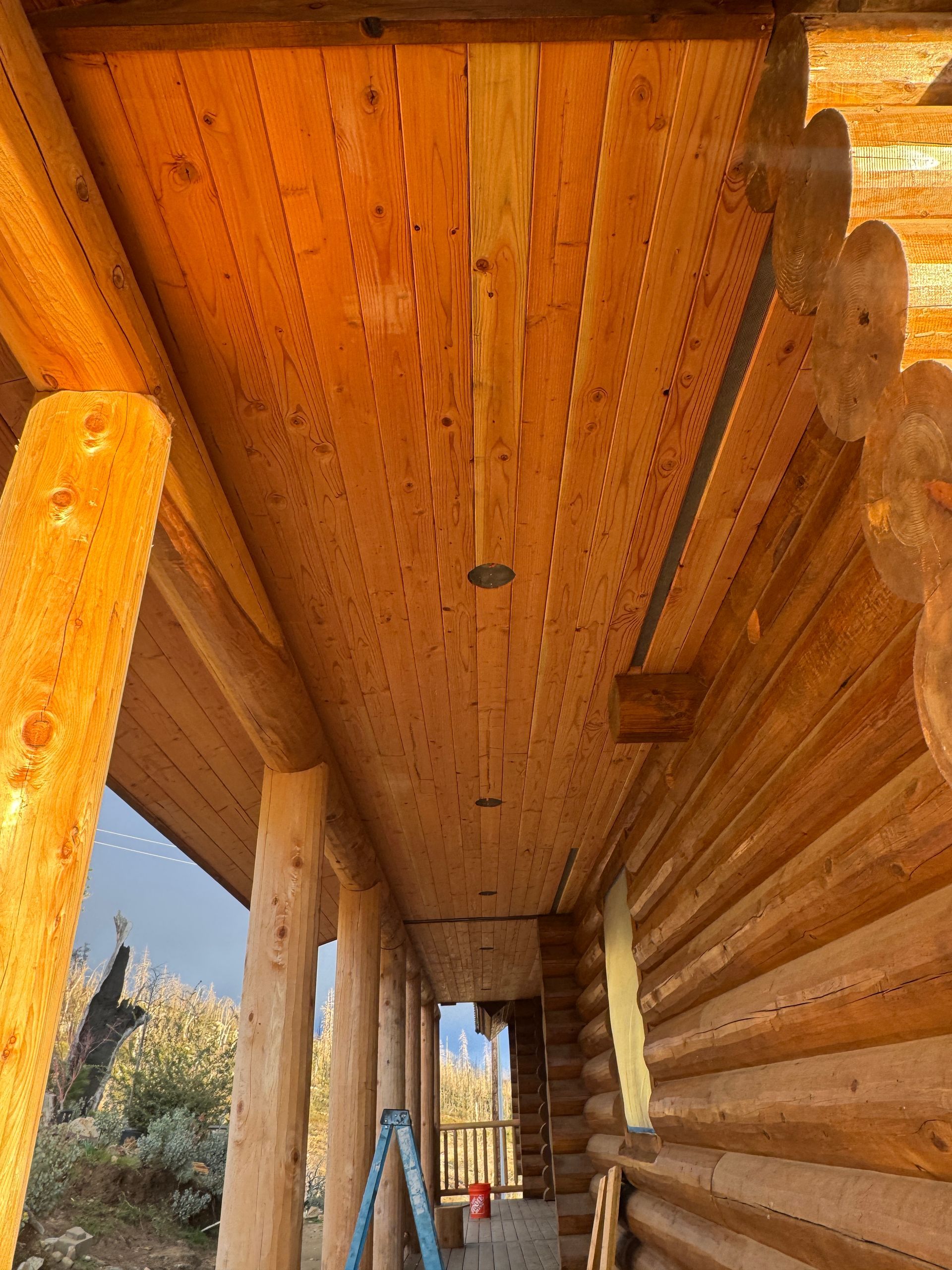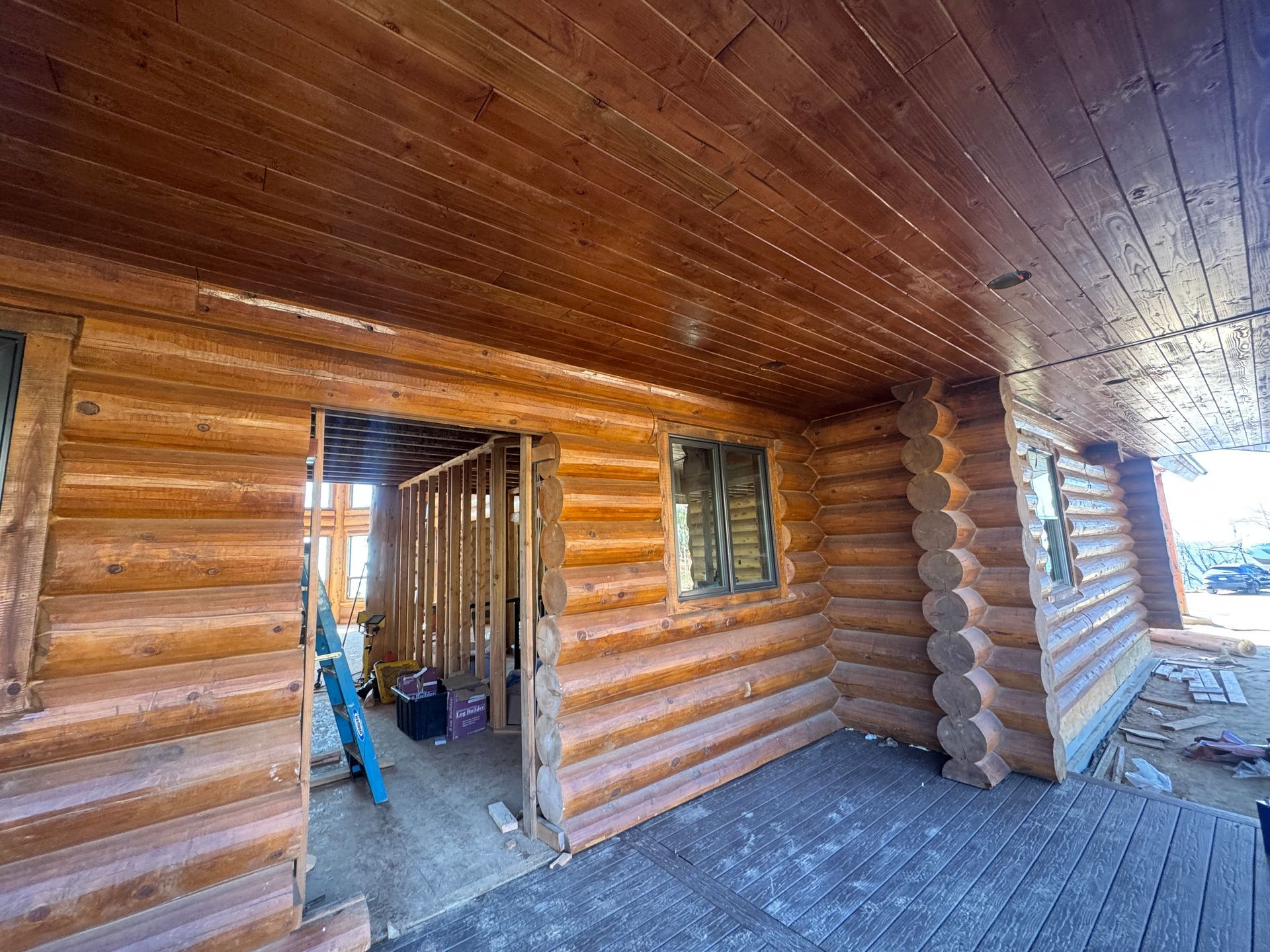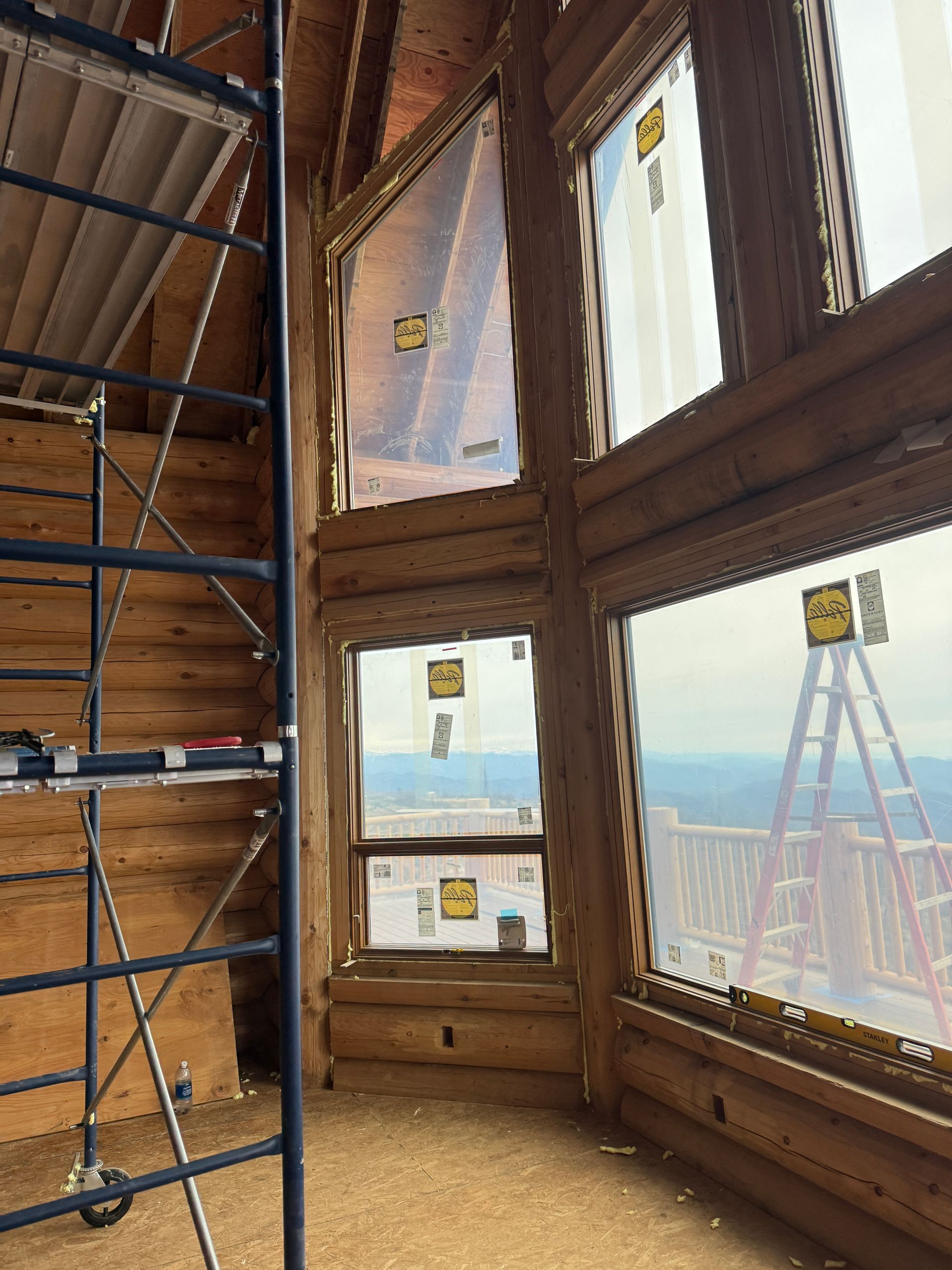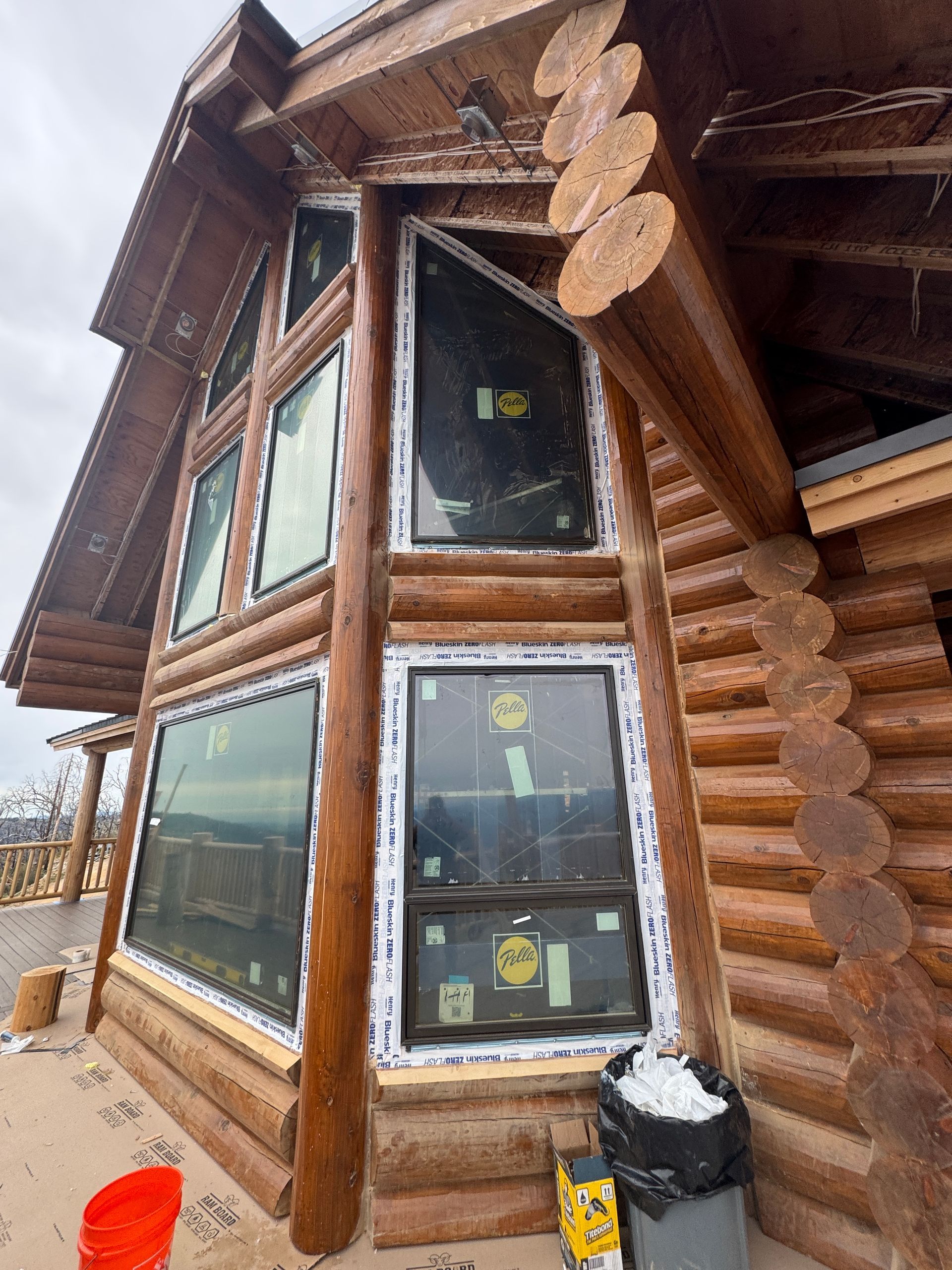 Interior chinking is completed around windows and doors, with ongoing work on exterior post detailing for consistency and protection.