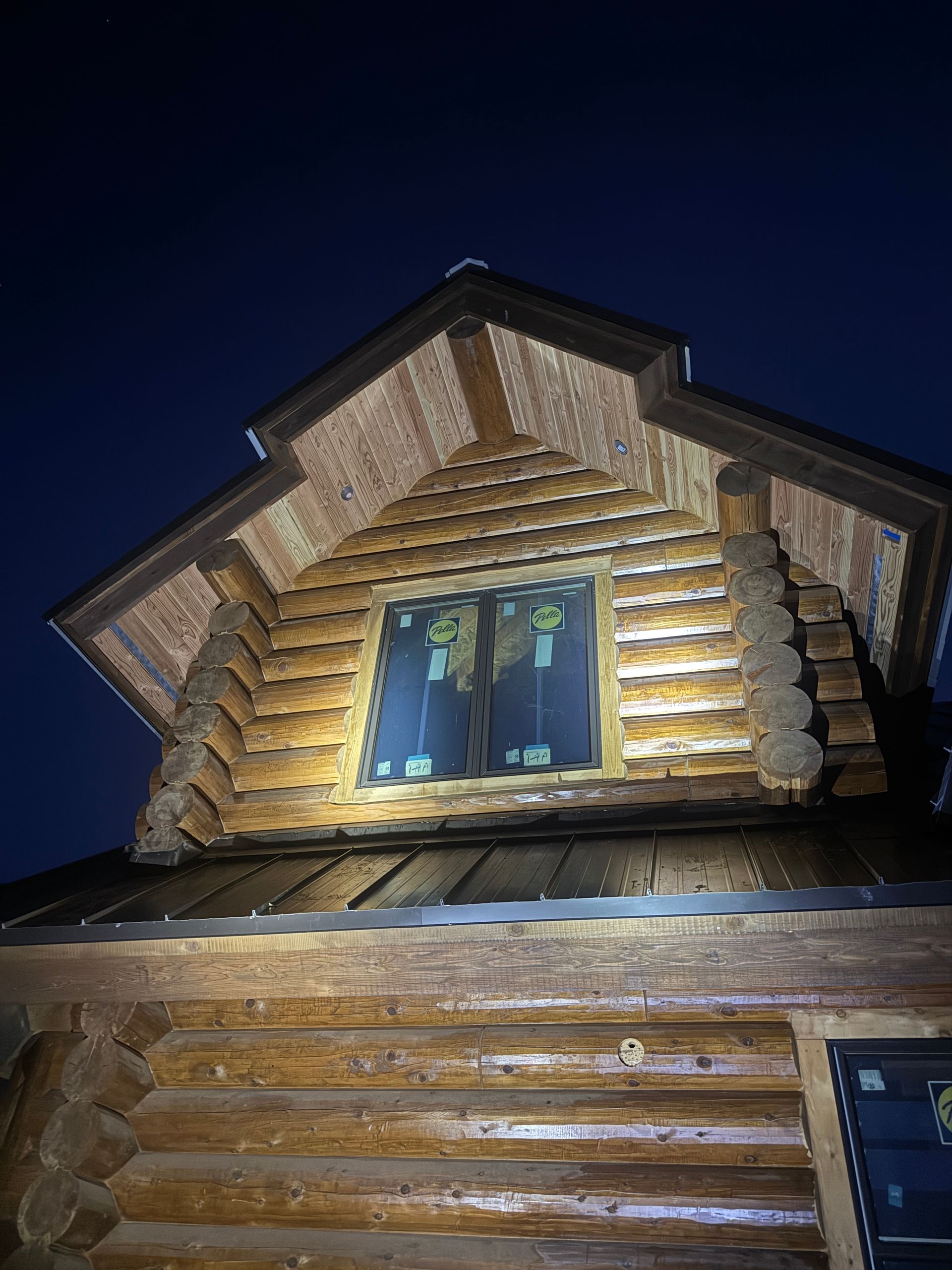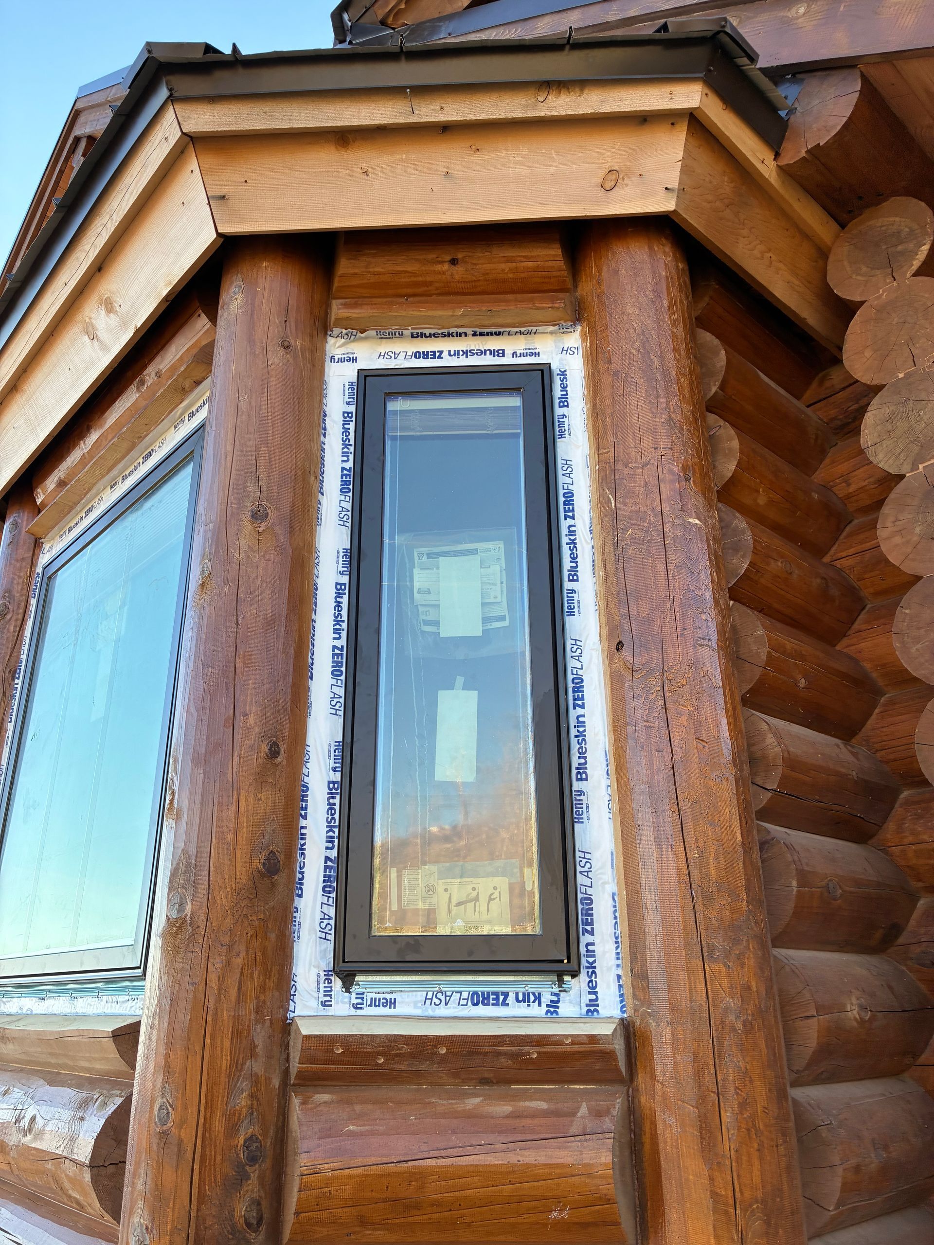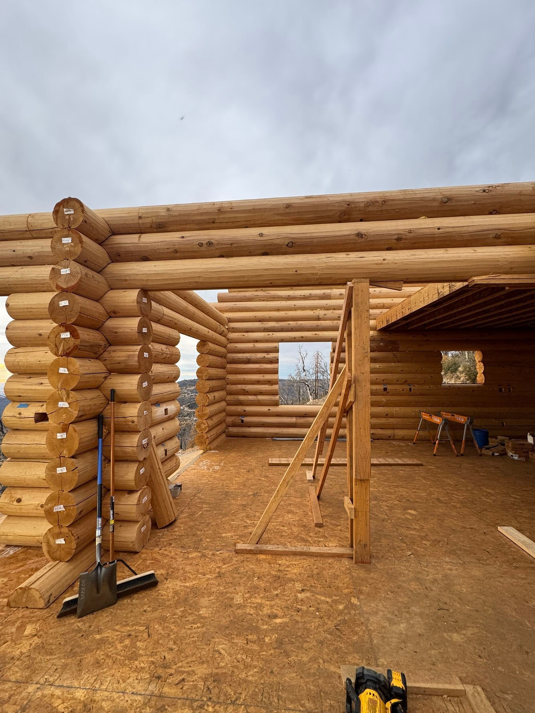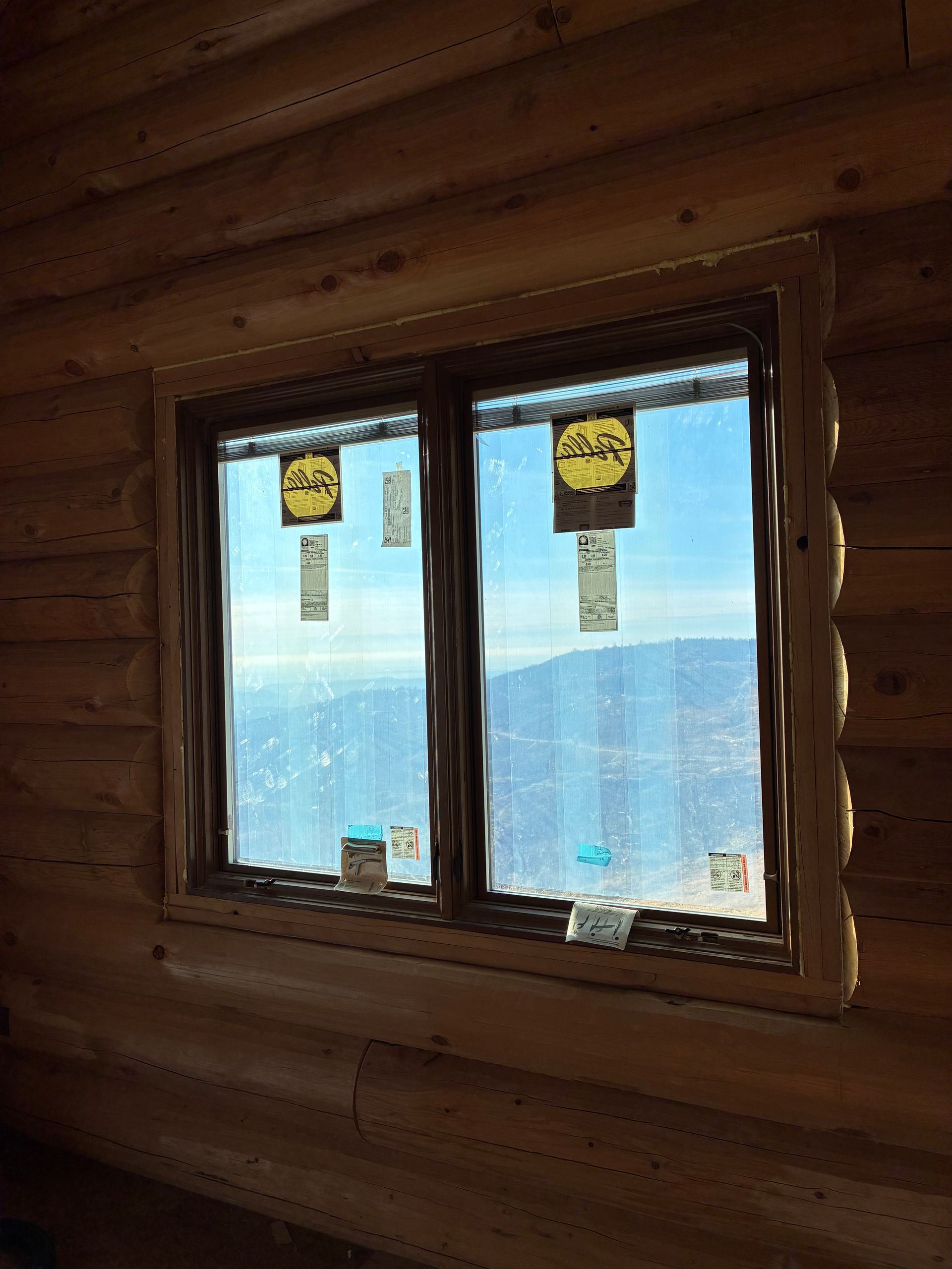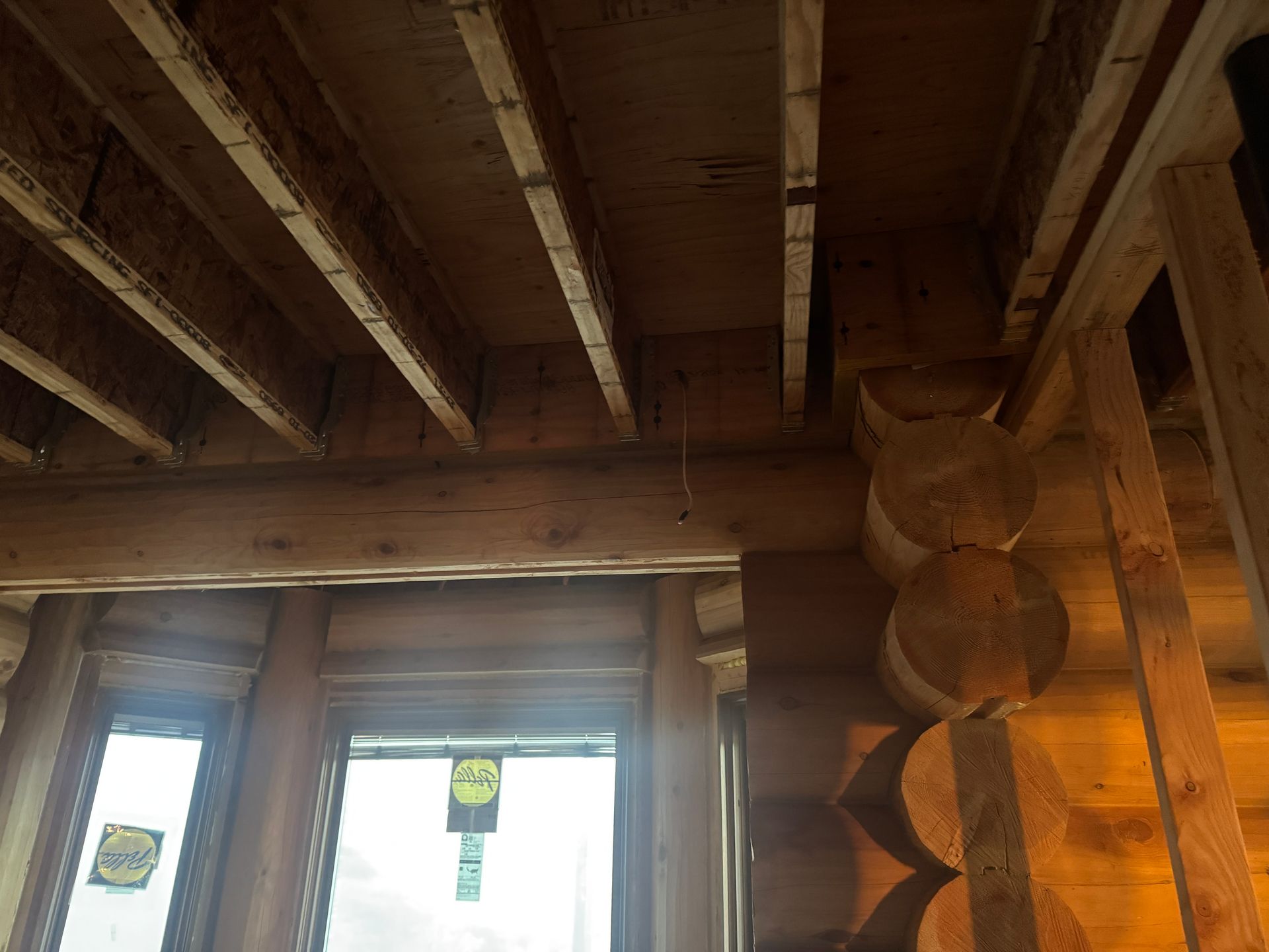 Interior chinking is completed around windows and doors, with ongoing work on exterior post detailing for consistency and protection.