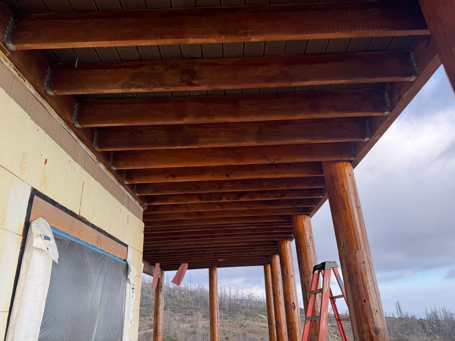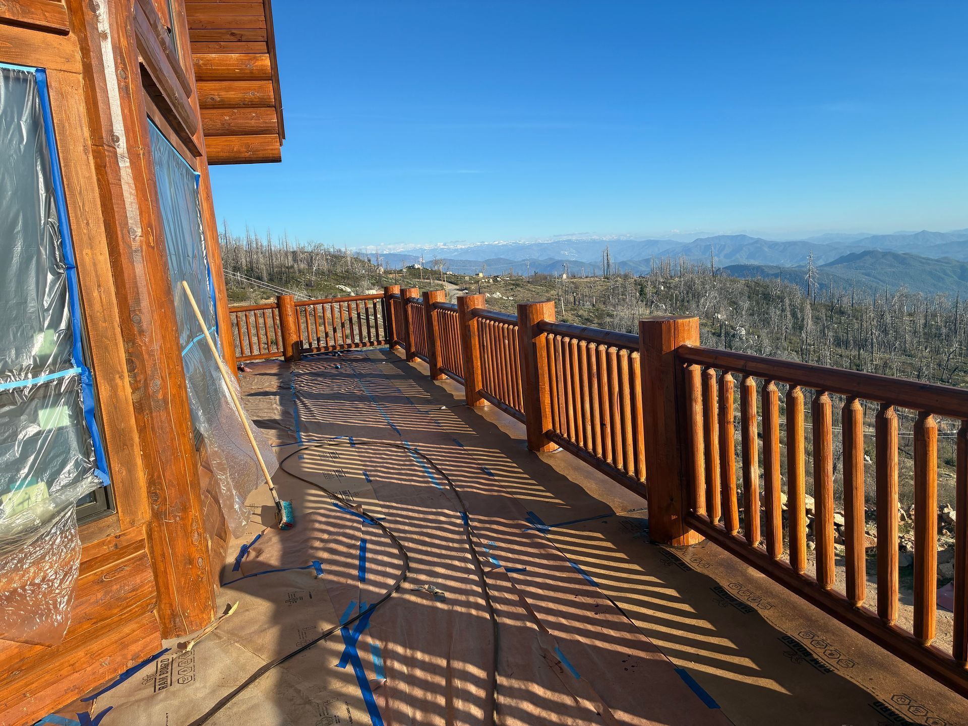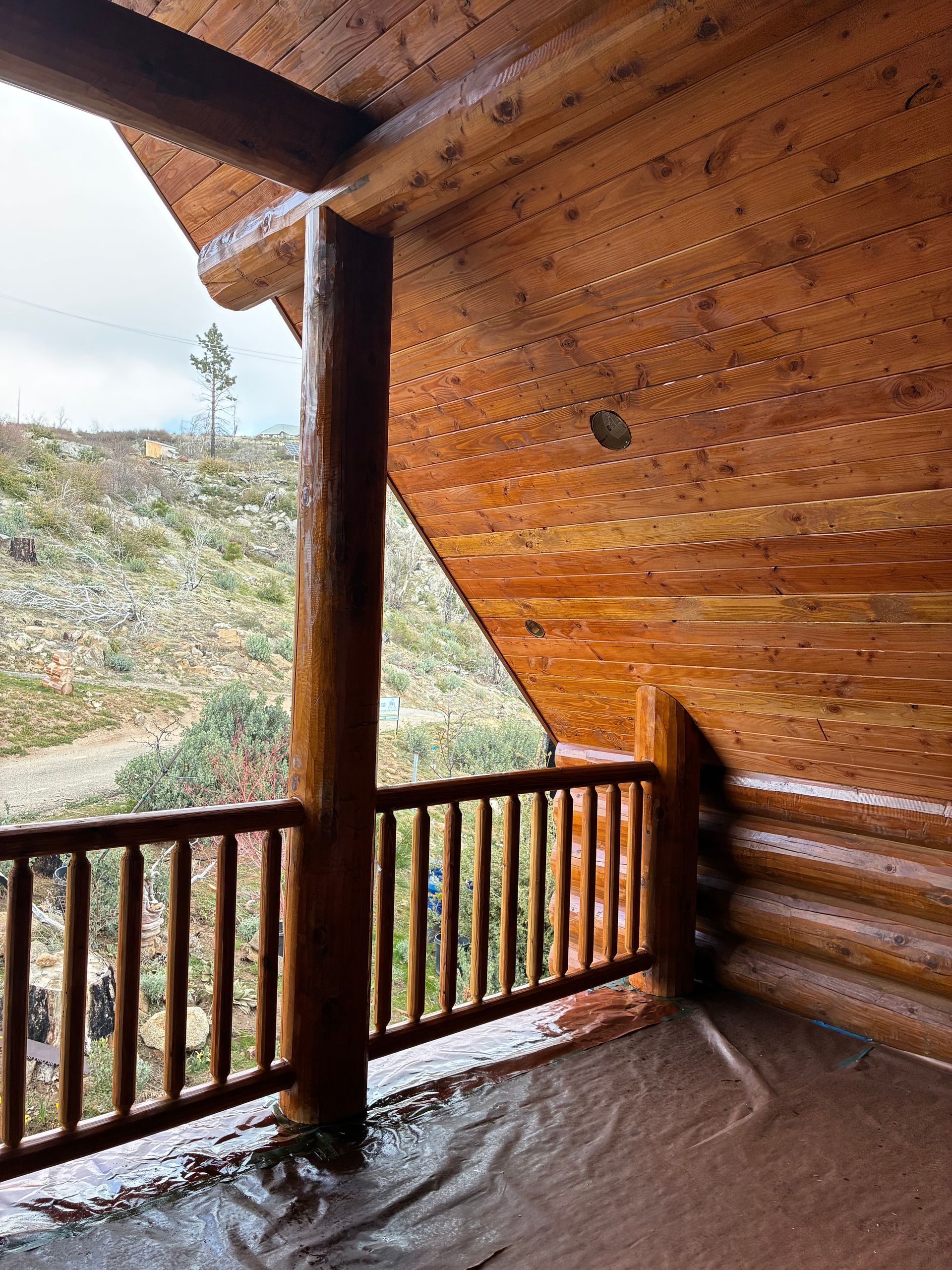 Multiple coats are applied across decks, fascia, floor joists, and window trims, enhancing durability while bringing out the natural character of the wood.