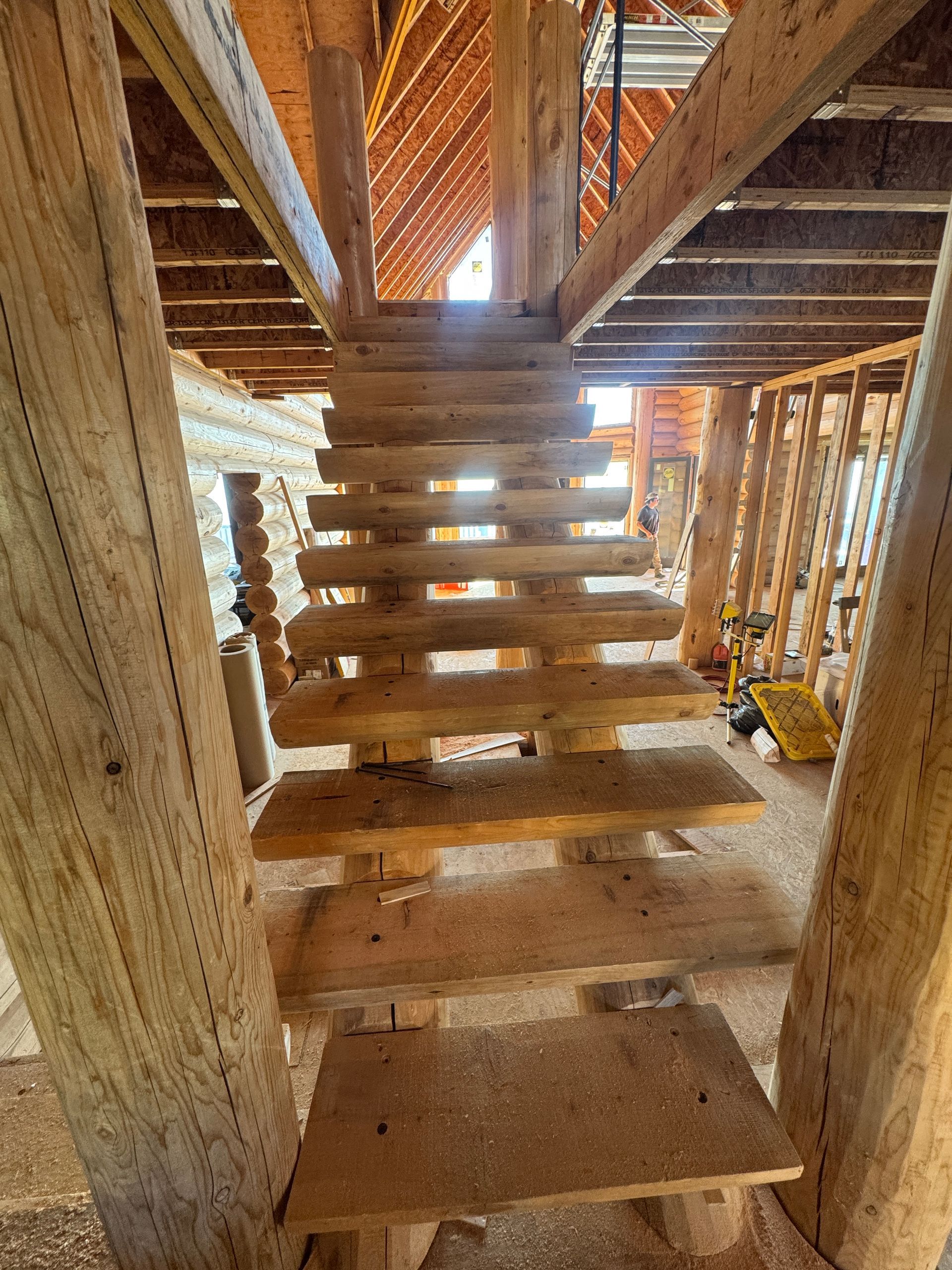 Installation of interior stair stringers connecting the main floor to the loft is underway, forming a key structural and functional element of the home.